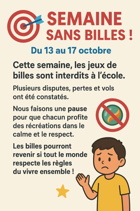 Suite à plusieurs incidents survenus du 13 au 17 octobre (disputes, pertes, vols signalés), les jeux de billes sont suspendus jusqu’à nouvel ordre.